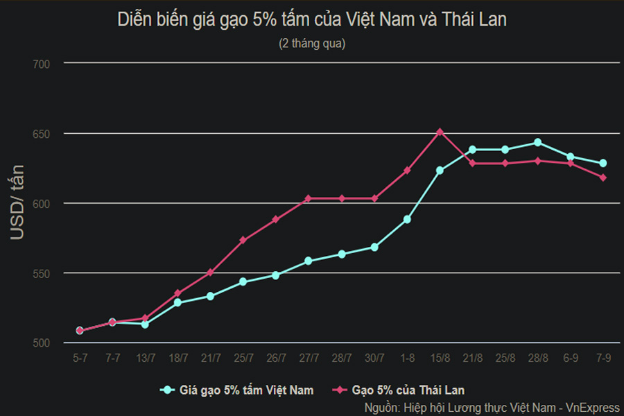 Diễn biến giá gạo 5% tấm của Việt Nam và Thái Lan