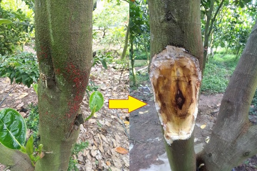 Đối với cây mít bị nặng, theo kinh nghiệm của đa số người dân, cần phải dùng dao cạo hết phần nấm hồng bám trên thân cây rồi mới quét thuốc vào mới hiệu quả.