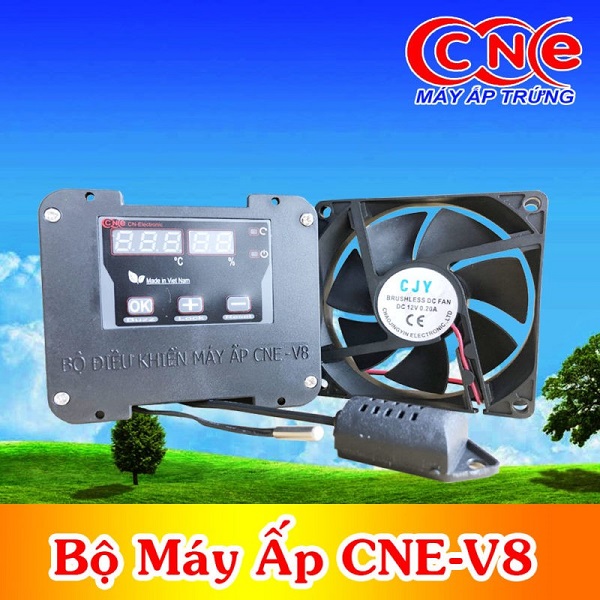Bạn chuẩn bị một bộ điều khiển máy ấp trứng. Hình dưới đây là bộ điều khiển CNE v8 với đầu dò điện có sẵn, 1 quạt tản nhiệt kèm với máy dò ẩm.