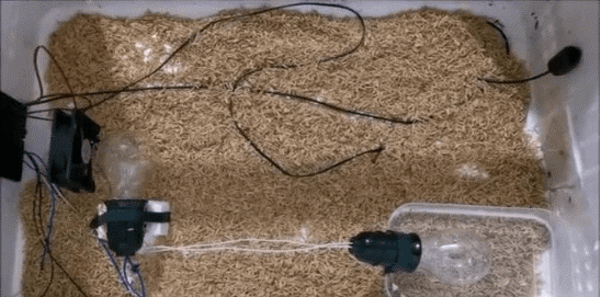 - Phần đầu dò nhiệt và đầu dò ẩm. Nếu đảo tay không dùng khay đảo tự động: bà con có thể treo đầu dò ẩm lên vách thùng (vị trí nào trong thùng cũng được). Đầu dò nhiệt buộc cố định vào 1 dụng cụ (que tre) cắm xuống sàn thùng, cách bóng đèn tạo nhiệt tầm 20cm. Trải 1 lớp trấu mỏng hoặc mùn cưa xuống sàn thùng và đặt trứng lên đó.